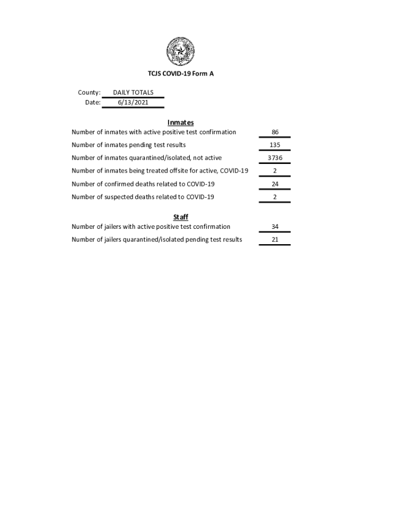 TCAS COVID-19 Form A County: Date:DAILY TOTALS 6/13/2021Inmates Number of inmates with active positive test confirmation86Number of inmates pending test results135Number of inmates quarantined/isolated,