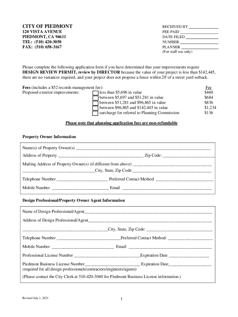CITY OF PIEDMONTRECEIVED BY FEE PAID DATE FILED NUMBER PLANNER (For staff use only)120 VISTA AVENUE PIEDMONT, CA 94611 TEL: (510) 4203050 FAX: (510) 6583167Please complete the following application