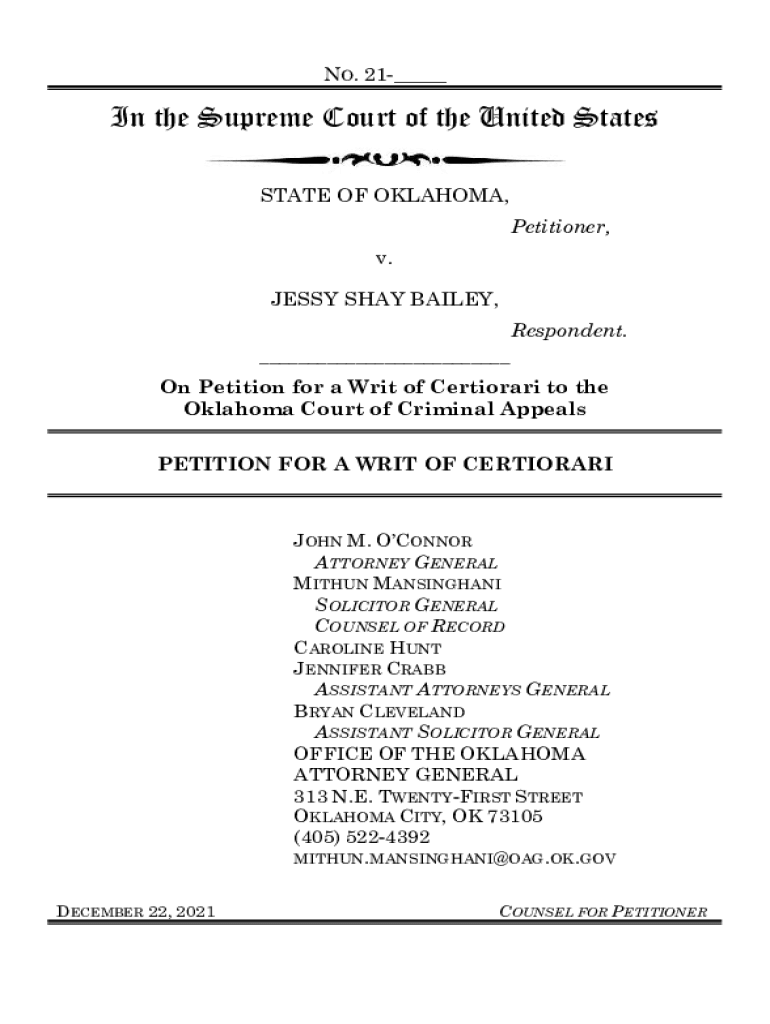 NO. 21___In the Supreme Court of the United States STATE OF OKLAHOMA, Petitioner, v. JESSY SHAY BAILEY, Respondent. ___On Petition for a Writ of Certiorari to the Oklahoma Court of Criminal Appeals