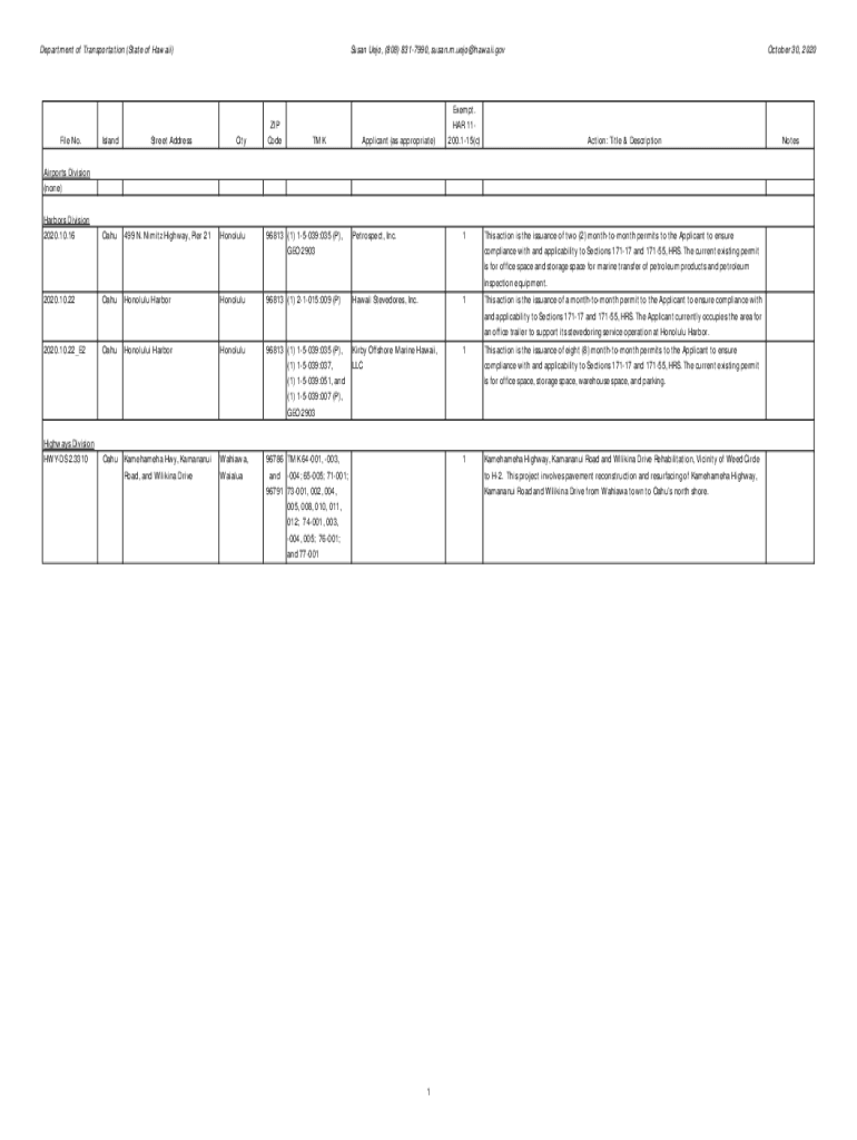 Department of Transportation (State of Hawaii)File No. IslandStreet Address Susan UEJF, (808) 8317990, susan.m.uejo@hawaii.govCityZIP CodeTMKApplicant (as appropriate)Exempt. HAD 11200.115©October