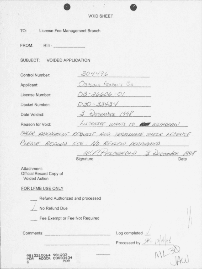 !!SUBJECT:VOIDED APPLICATIONControl Number:DON 96Applicant:OSesou2 S2oducrr Beau.! License Number:08 c26666 O/!|Docket Number:D30
