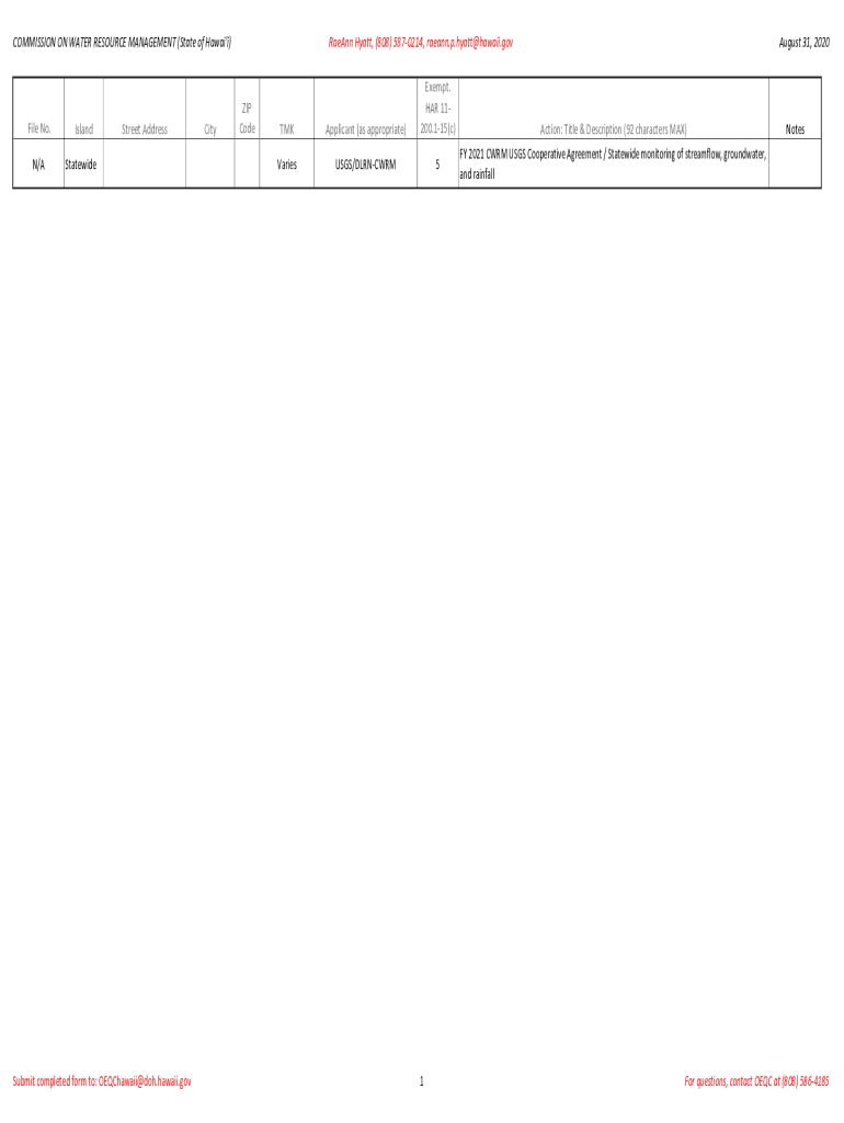 COMMISSION ON WATER RESOURCE MANAGEMENT (State of Hawaii\'i)File No. N/AIslandStreet AddressStatewideSubmit completed form to: OEQChawaii@doh.hawaii.govCityRaeAnn Hyatt, (808) 5870214, raeann.p.hyatt@hawaii.govZIP
