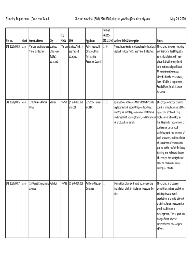 Planning Department (County of Maui)Clayton Yeshiva, (808) 2708205, clayton.yoshida@mauicounty.govZip Code May 29, 2020Exempt. HAD 11200.1.15© Action: Title & Description Applicant Notes Robin New