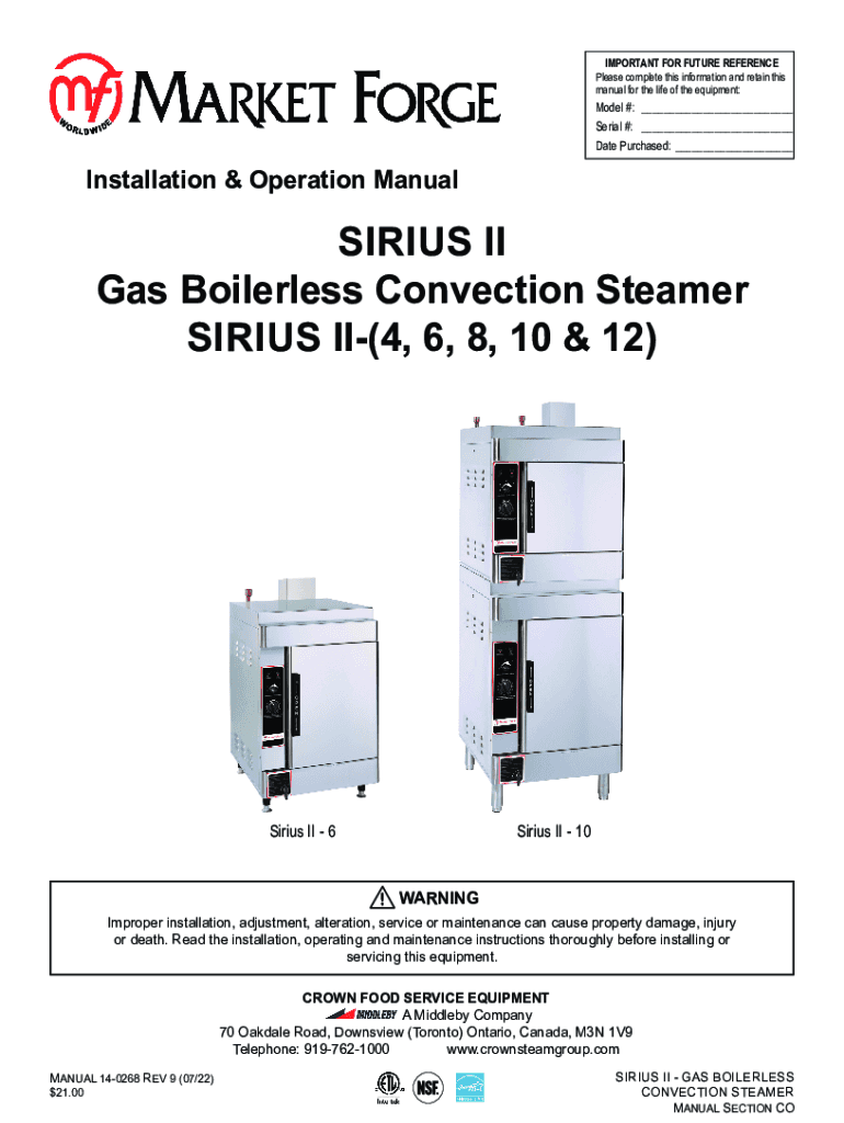 IMPORTANT FOR FUTURE REFERENCE Please complete this information and retain this manual for the life of the equipment:Model #: ___ Serial #: ___ Date Purchased: ___Installation & Operation ManualSIRIUS