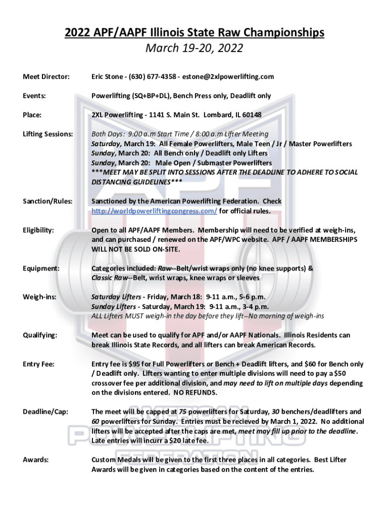 2022 APF/AAAF Illinois State Raw Championships March 1920, 2022 Meet Director:Eric Stone (630) 6774358 estone@2xlpowerlifting.comEvents:Powerlifting (SQ+BP+DL), Bench Press only, Deadlift anyplace:2XL
