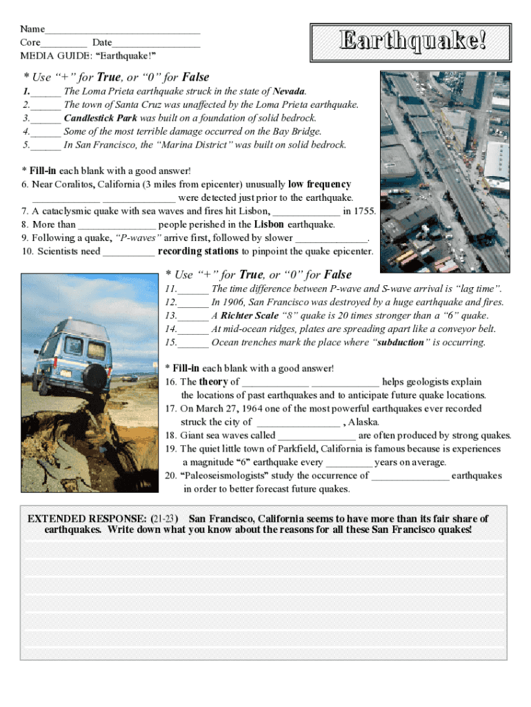 Name___ Core___ Date___ MEDIA GUIDE: Earthquake! Earthquake!* Use + for True, or 0 for False 1.___ The Coma Pietà earthquake struck in the state of Nevada. 2.___ The town of Santa Cruz was unaffected