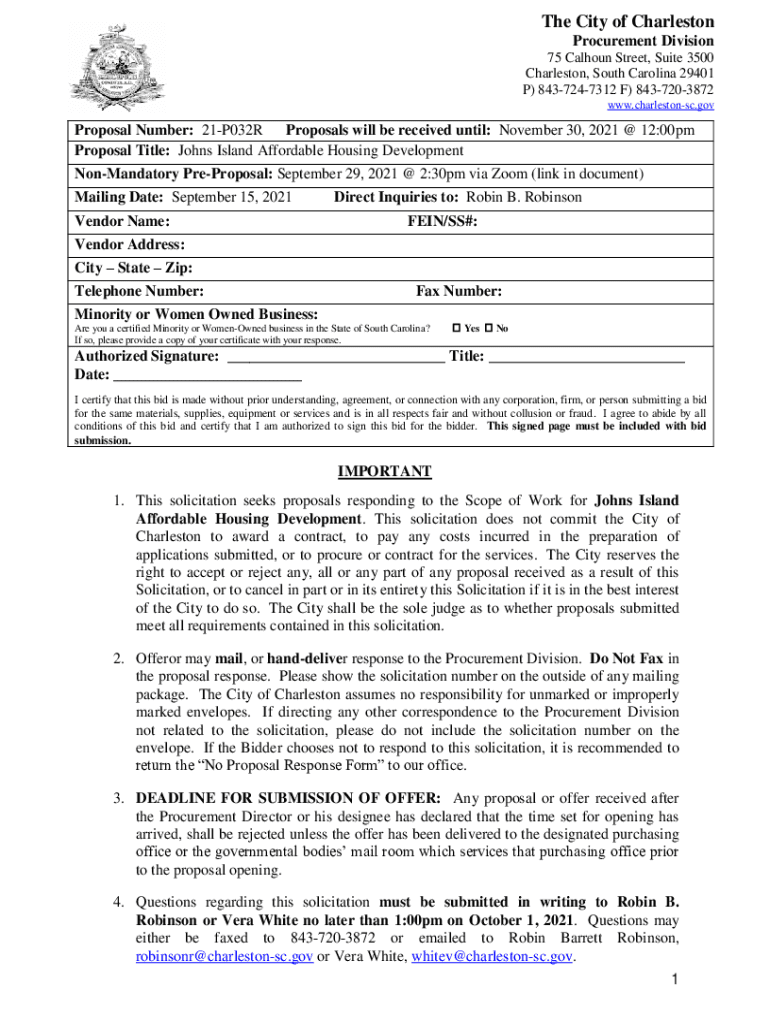 The City of Charleston Procurement Division 75 Calhoun Street, Suite 3500 Charleston, South Carolina 29401 P) 8437247312 F) 8437203872 www.charlestonsc.govProposal Number: 21P032R Proposals will be