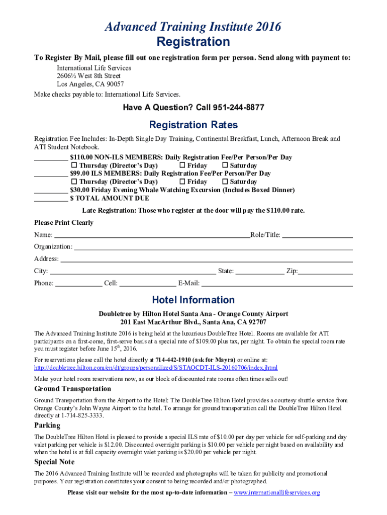 Advanced Training Institute 2016 Registration To Register By Mail, please fill out one registration form per person. Send along with payment to: International Life Services 2606 West 8th Street Los