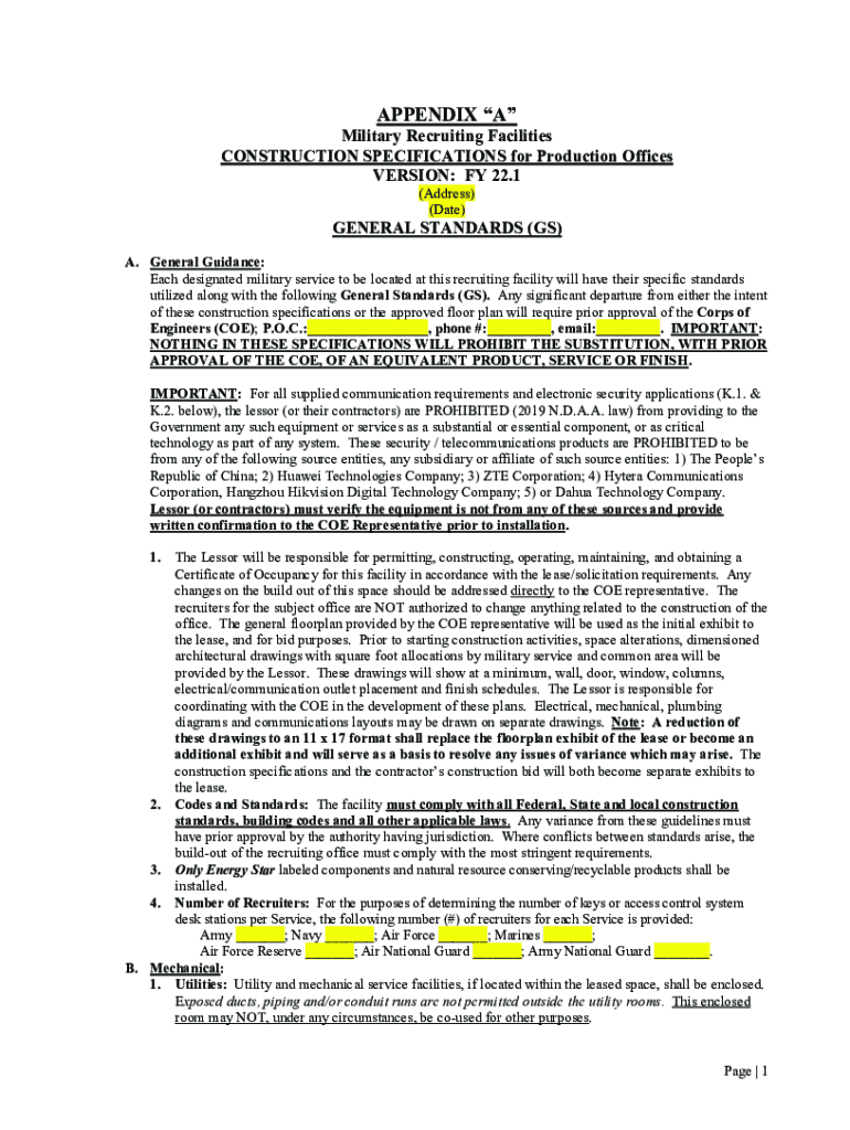 APPENDIX Military Recruiting Facilities CONSTRUCTION SPECIFICATIONS for Production Offices VERSION: FY 22.1 (Address) (Date)GENERAL STANDARDS (GS) A. General Guidance: Each designated military service