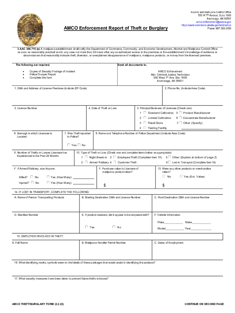 AMMO Enforcement Report of Theft or Burglary3 AAC 306.715 (e) A marijuana establishment shall notify the Department of Commerce, Community, and Economic Development, Alcohol and Marijuana Control