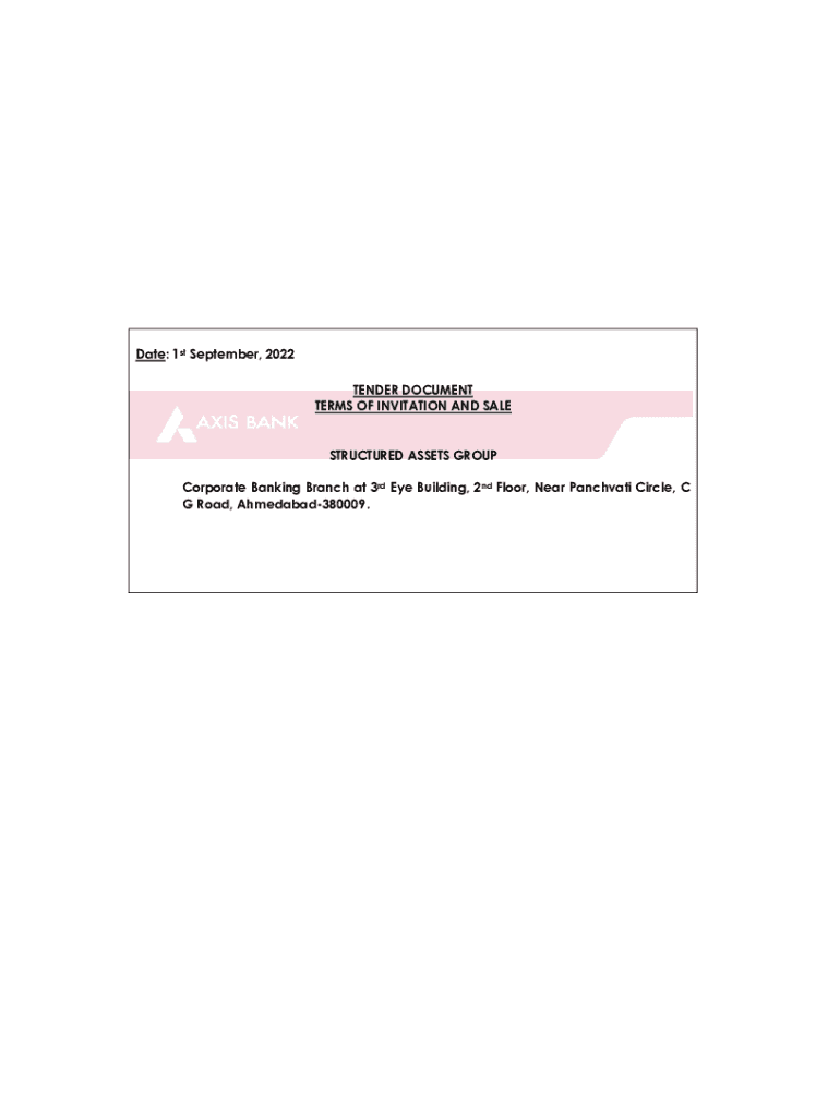 Date: 1st September 2022 TENDER DOCUMENT TERMS OF INVITATION AND SALE STRUCTURED ASSETS GROUP Corporate Banking Branch at 3rd Eye Building, 2nd Floor, Near Pancreatic Circle, C G Road, Ahmedabad380009.KEY