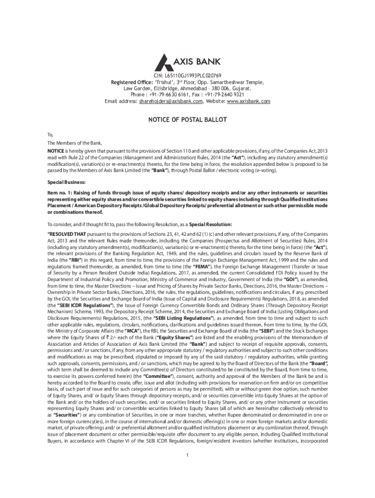 Get the free NOTICE OF POSTAL BALLOT - Axis Bank
