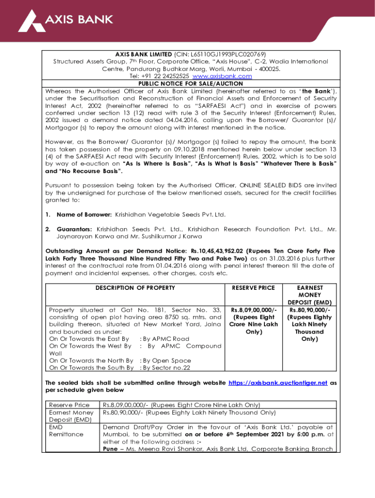 AXIS BANK LIMITED (IN: L65110GJ1993PLC020769) Structured Assets Group, 7th Floor, Corporate Office, Axis House, C2, Nadia International Center, Pandering Sudhakar Mary, World, Mumbai 400025. Tel: