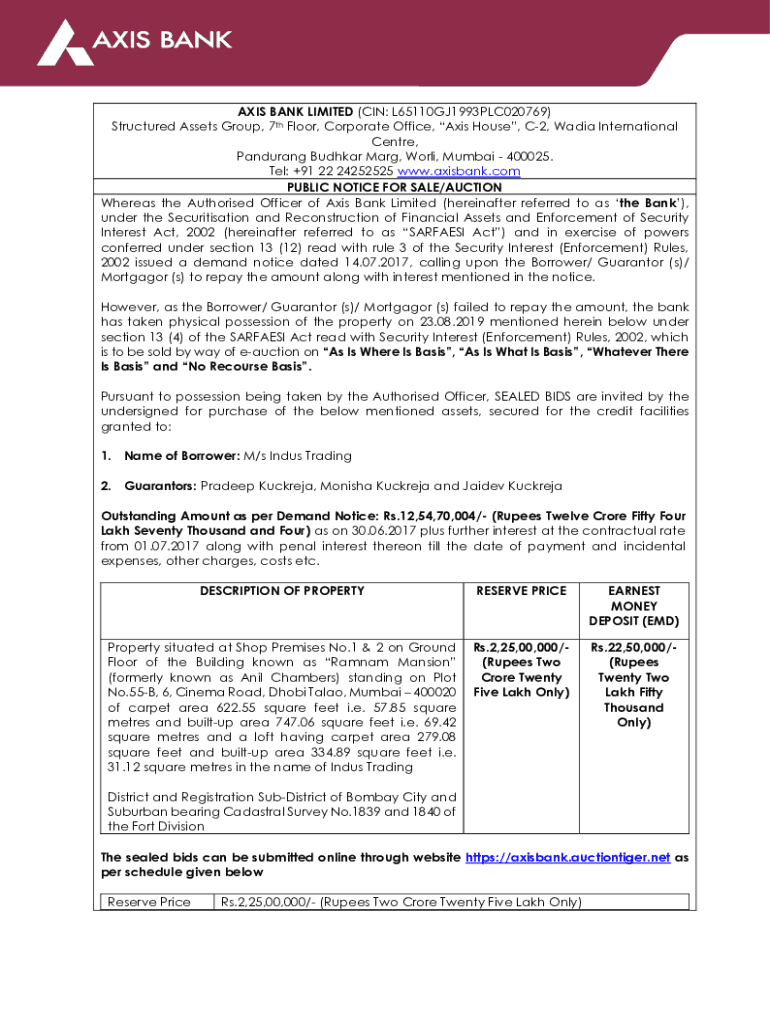 AXIS BANK LIMITED (IN: L65110GJ1993PLC020769) Structured Assets Group, 7th Floor, Corporate Office, Axis House, C2, Nadia International Center, Pandering Sudhakar Mary, World, Mumbai 400025. Tel: