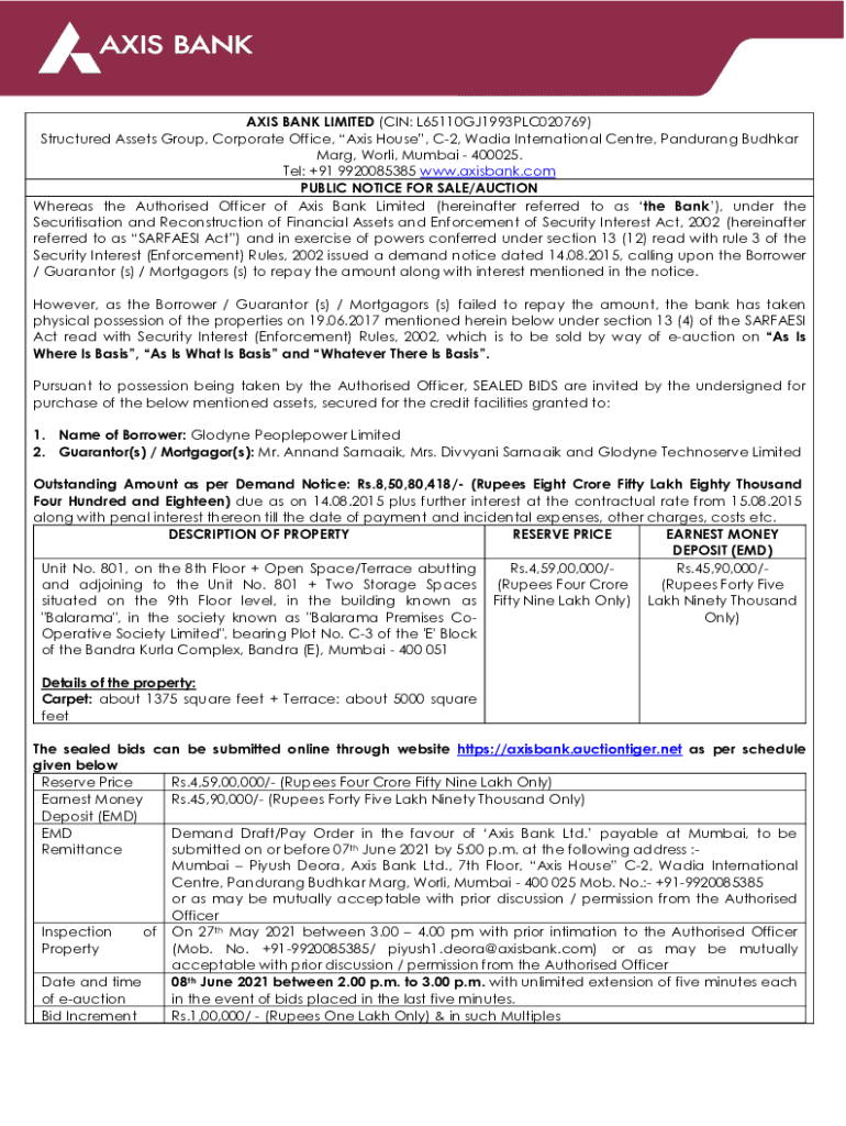 AXIS BANK LIMITED (IN: L65110GJ1993PLC020769) Structured Assets Group, Corporate Office, Axis House, C2, Nadia International Center, Pandering Sudhakar Mary, World, Mumbai 400025. Tel: +91 9920085385