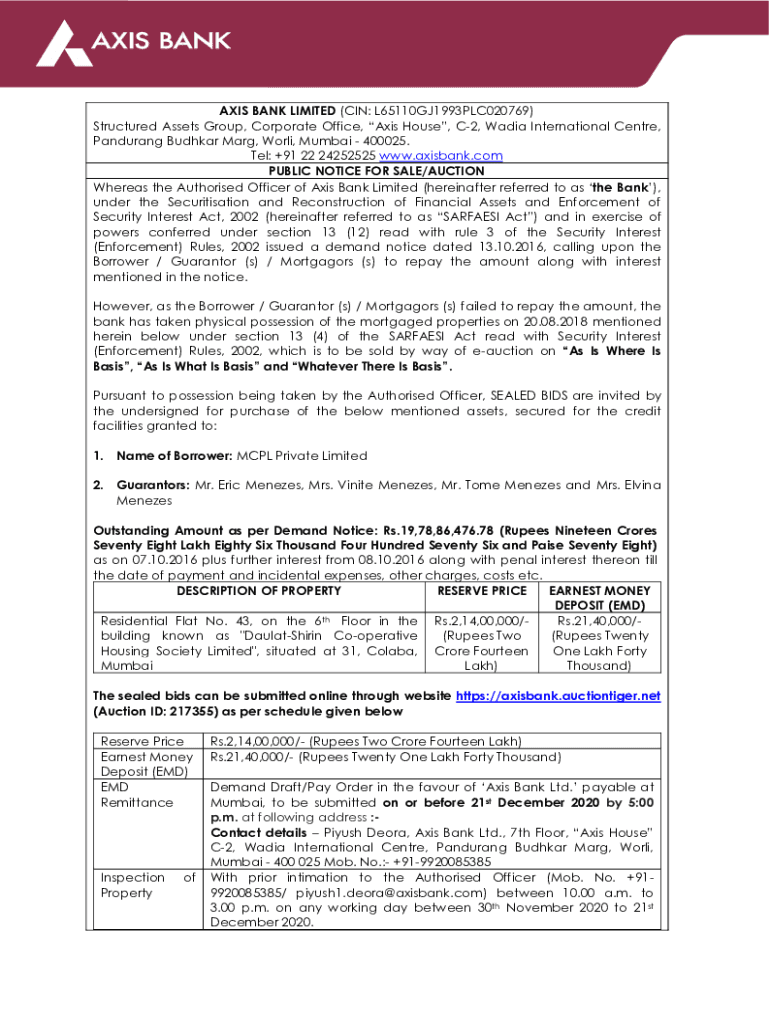 What is auction-notice-mcpl-flat-no-43pdf - axis bank?