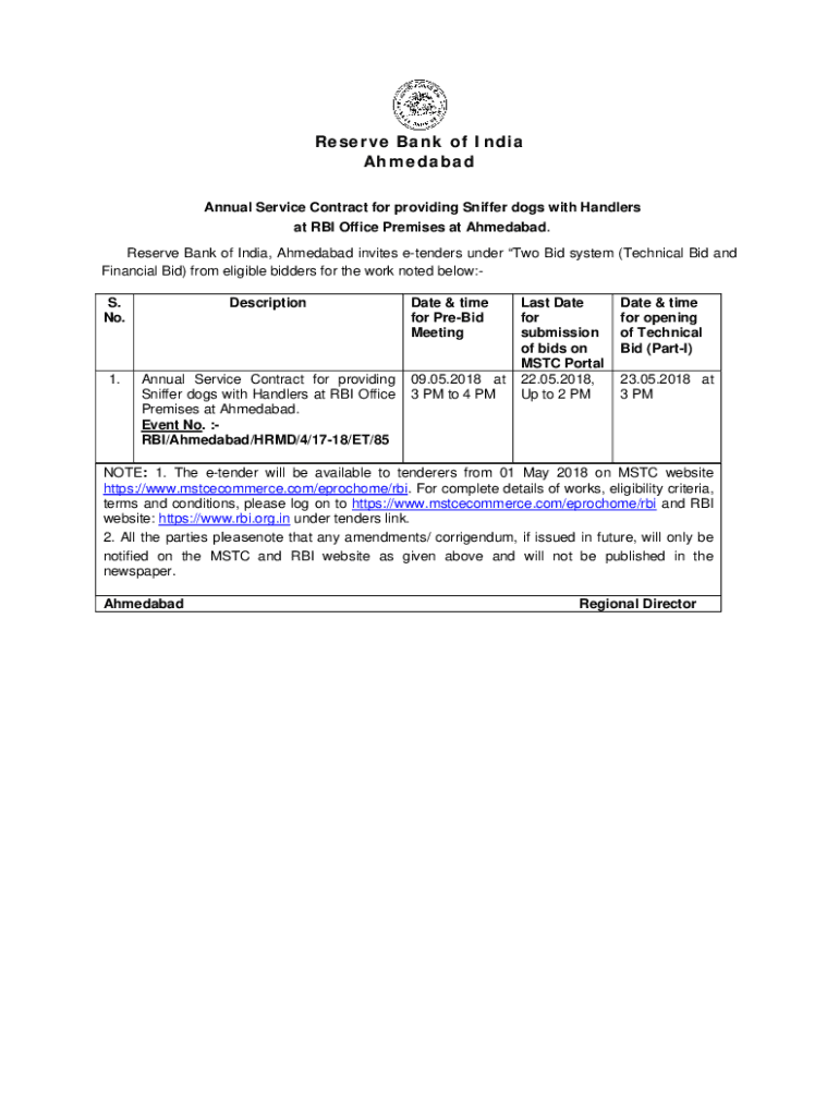 Reserve Bank of India Ahmedabad Annual Service Contract for providing Sniffer dogs with Handlers at RBI Office Premises at Ahmedabad. Reserve Bank of India, Ahmedabad invites tenders under Two Bid