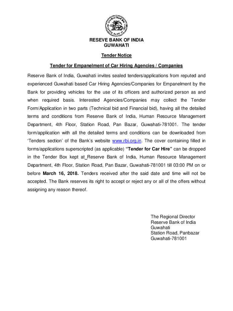 RESERVE BANK OF INDIA GUWAHATI Tender Notice Tender for Embankment of Car Hiring Agencies / Companies Reserve Bank of India, Guwahati invites sealed tenders/applications from reputed and experienced