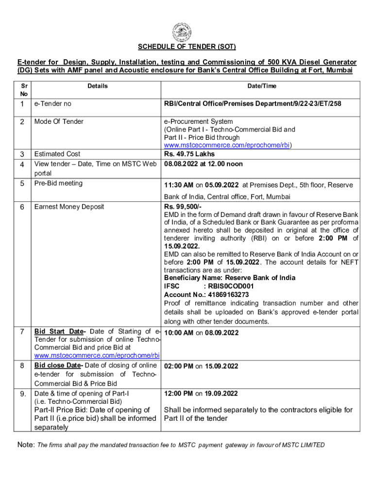 SCHEDULE OF TENDER (SOT)Tender for Design, Supply, Installation, testing and Commissioning of 500 AVA Diesel Generator (DG) Sets with AMF panel and Acoustic enclosure for Banks Central Office Building