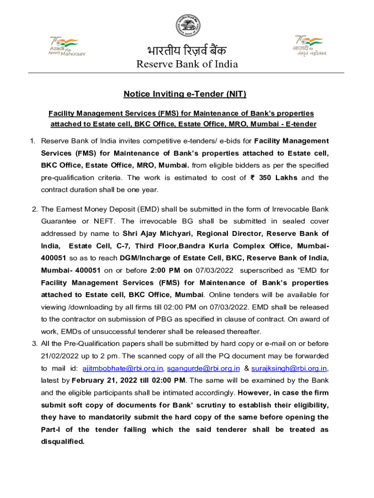Reserve Bank of India Notice Inviting tender (NIT) Facility Management Services (FMS) for Maintenance of Banks properties attached to Estate cell, BKC Office, Estate Office, MRO, Mumbai Tender 1.