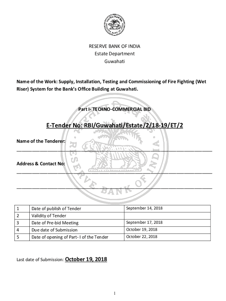 RESERVE BANK OF INDIA Estate Department GuwahatiName of the Work: Supply, Installation, Testing and Commissioning of Fire Fighting (Wet Riser) System for the Banks Office Building at Guwahati. Part
