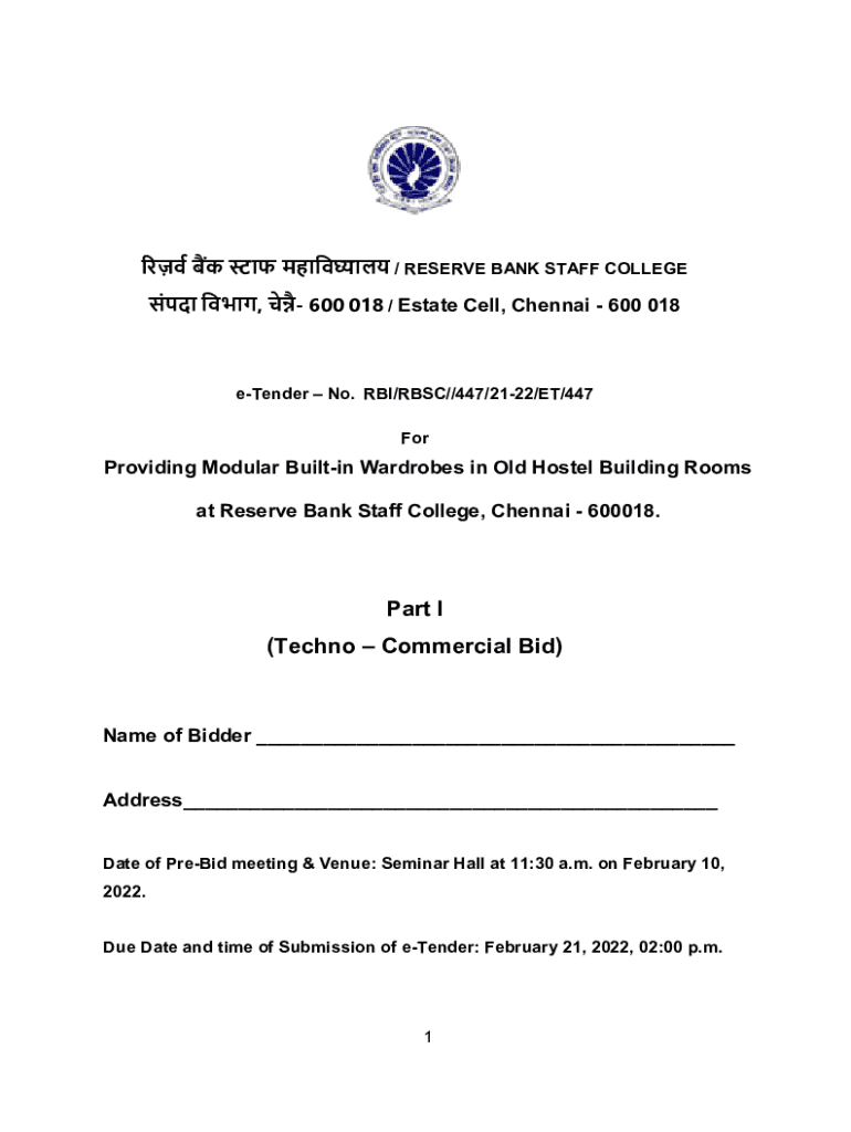 / RESERVE BANK STAFF COLLEGE, 600 018 / Estate Cell, Chennai 600 018eTender No. RBI/RISC//447/2122/ET/447 Providing Modular Builtin Wardrobes in Old Hostel Building Rooms at Reserve Bank Staff College,