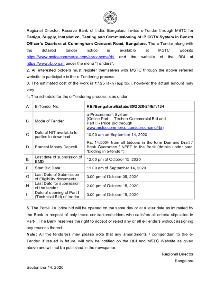 Regional Director, Reserve Bank of India, Bengaluru invites tender through MSC for