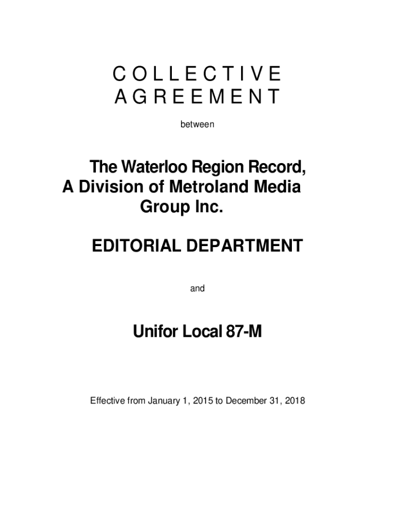 COLLECTIVE AGREEMENT between Waterloo Region Record, A Division of Metro land Media Group Inc. EDITORIAL DEPARTMENT andUnifor Local 87MEffective from January 1, 2015, to December 31, 2018LIST OF CONTENTS