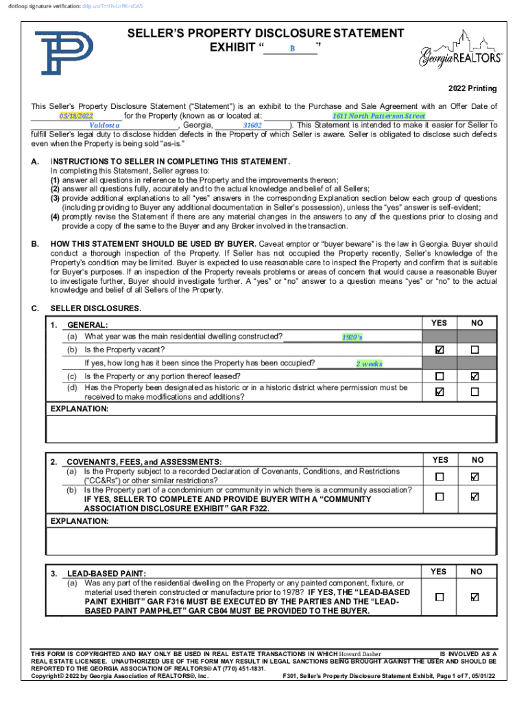 Dot loop signature verification: dtlp.us/Tm1hUrRKsOASSELLERS PROPERTY DISCLOSURE STATEMENT EXHIBIT ___ B 2022 Printing This Sellers Property Disclosure Statement (Statement) is an exhibit to the Purchase