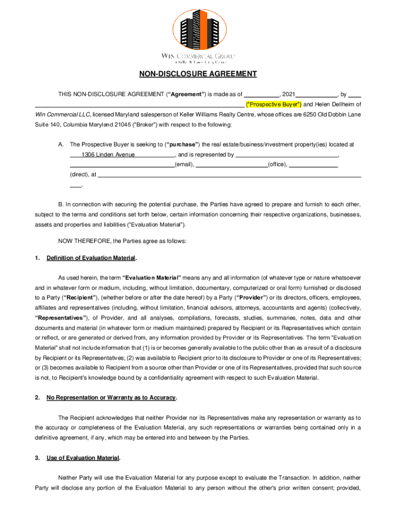 NONDISCLOSURE AGREEMENT THIS NONDISCLOSURE AGREEMENT (Agreement) is made as of, 2021, by(Prospective Buyer) and Helen Müllheim of Win Commercial LLC, licensed Maryland salesperson of Keller Williams