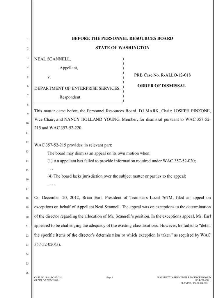 1BEFORE THE PERSONNEL RESOURCES BOARD2STATE OF WASHINGTON3 4 5 6 7)) Appellant,) ) v.) ) DEPARTMENT OF ENTERPRISE SERVICES,) )) Respondent. ) NEAL SCANNELL, PUB Case No. RALLO12018 ORDER OF DISMISSAL8