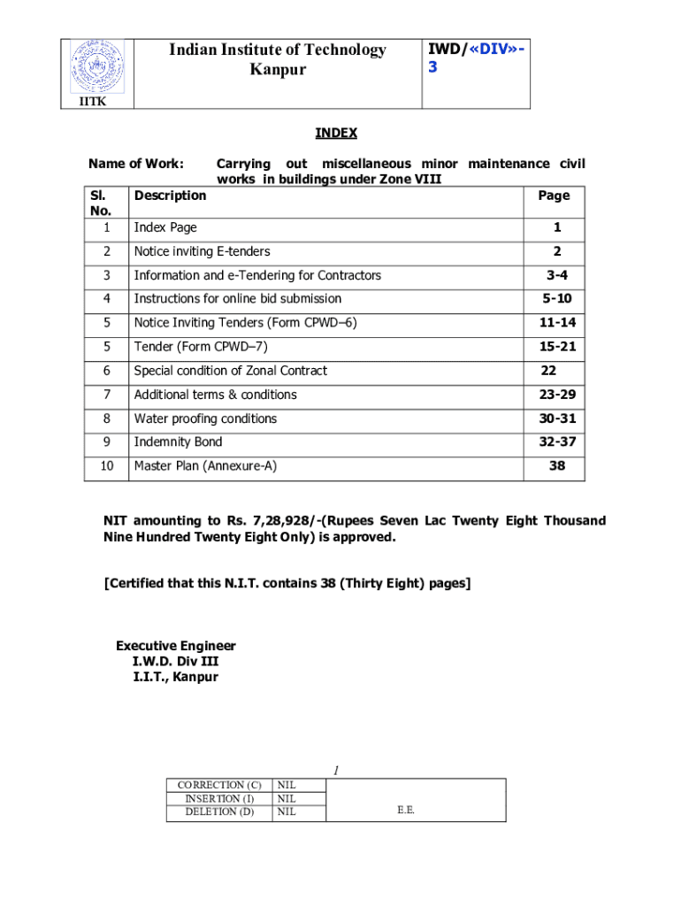 ID/DIV3Indian Institute of Technology Kanpur IIT INDEX Name of Work: SL. No. 1Carrying out miscellaneous minor maintenance civil works in buildings under Zone VIII Description Page Index Page12Notice