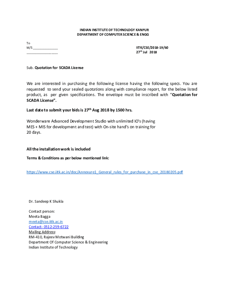 Get the free Sub. Quotation for SCADA License - iitk.ac.in