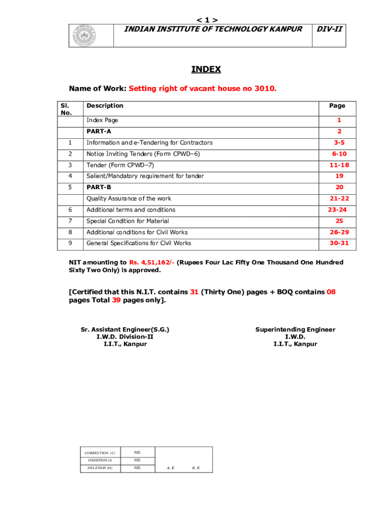 1INDIAN INSTITUTE OF TECHNOLOGY KANPURDIVIIINDEX Name of Work: Setting right of vacant house no 3010. SL. No. DescriptionPageIndex Page1PARTA21Information and tendering for Contractors352Notice Inviting