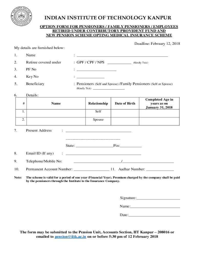 INDIAN INSTITUTE OF TECHNOLOGY KANPUR OPTION FORM FOR PENSIONERS / FAMILY PENSIONERS / EMPLOYEES RETIRED UNDER CONTRIBUTORY PROVIDENT FUND AND NEW PENSION SCHEME OPTING MEDICAL INSURANCE SCHEME Deadline:
