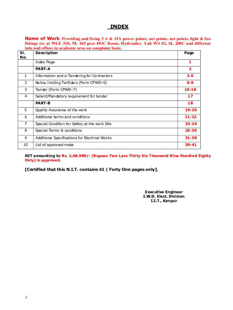 INDEX Name of Work: Providing and fixing 5 A & 15A power points, net points, net points, light & fan fittings etc at WE 310, NL 105 post DOC Room, Hydraulics Lab WS 02, SL 208C and different labs