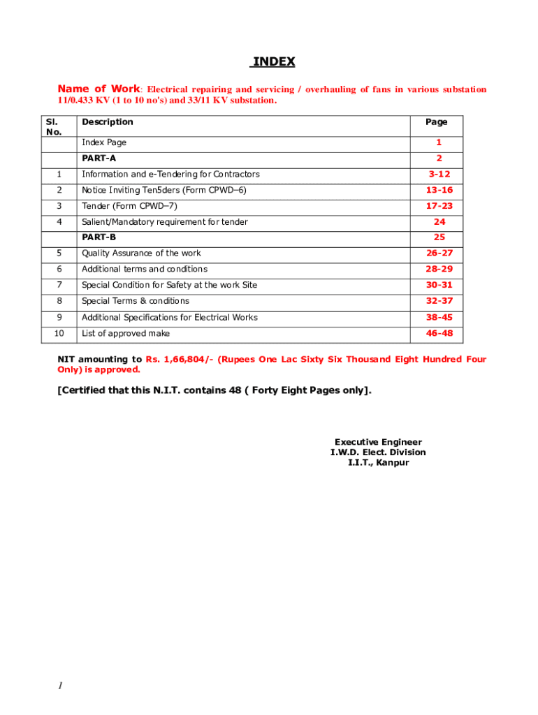 INDEX Name of Work: Electrical repairing and servicing / overhauling of fans in various substation 11/0.433 KV (1 to 10 no\'s) and 33/11 KV substation. SL. No. DescriptionPageIndex Page1PARTA21Information
