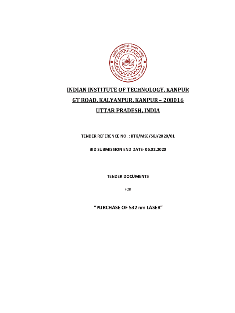 INDIAN INSTITUTE OF TECHNOLOGY, KANPUR ROAD, KANPUR, KANPUR 208016UTTAR PRADESH, INDIATENDERREFERENCENO.:IIT/MSE/SKY/2020/01 BIDSUBMISSIONENDDATE06.02.2020 TENDERDOCUMENTS FOR PURCHASEOF532nmLASER