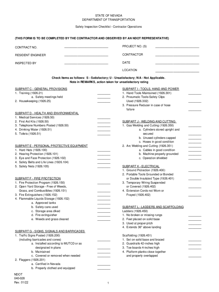 STATE OF NEVADA DEPARTMENT OF TRANSPORTATION Safety Inspection Checklist Contractor Operations(THIS FORM IS TO BE COMPLETED BY THE CONTRACTOR AND OBSERVED BY AN NOT REPRESENTATIVE) CONTRACT NO.___PROJECT