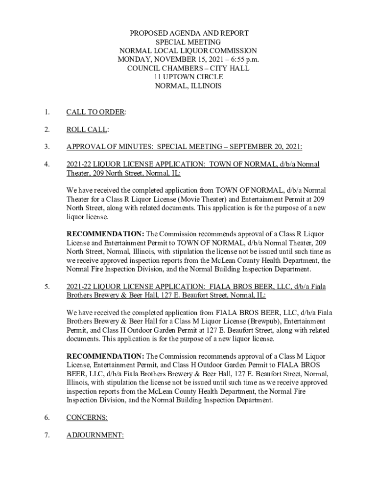 PROPOSED AGENDA AND REPORT SPECIAL MEETING NORMAL LOCAL LIQUOR COMMISSION MONDAY, NOVEMBER 15, 2021 6:55 p.m. COUNCIL CHAMBERS CITY HALL 11 UPTOWN CIRCLE NORMAL, ILLINOIS 1.CALL TO ORDER:2.ROLL CALL:3.APPROVAL
