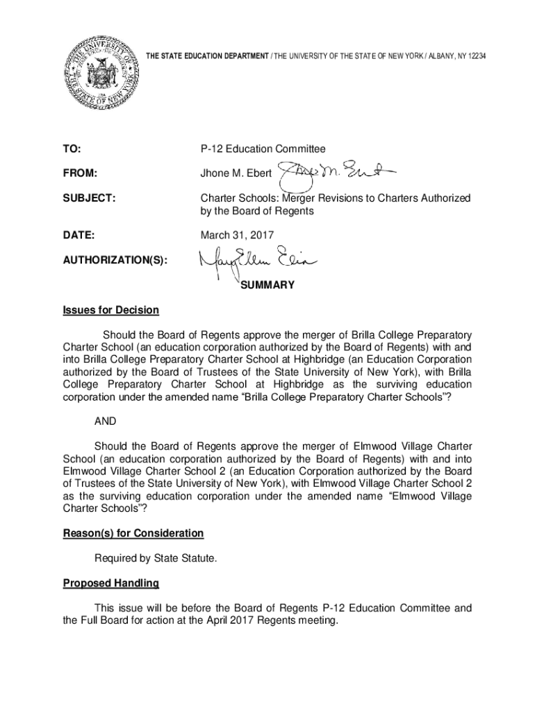 THE STATE EDUCATION DEPARTMENT / THE UNIVERSITY OF THE STATE OF NEW YORK / ALBANY, NY 12234TO:P12 Education CommitteeFROM:Phone M. EbertSUBJECT:Charter Schools: Merger Revisions to Charters Authorized
