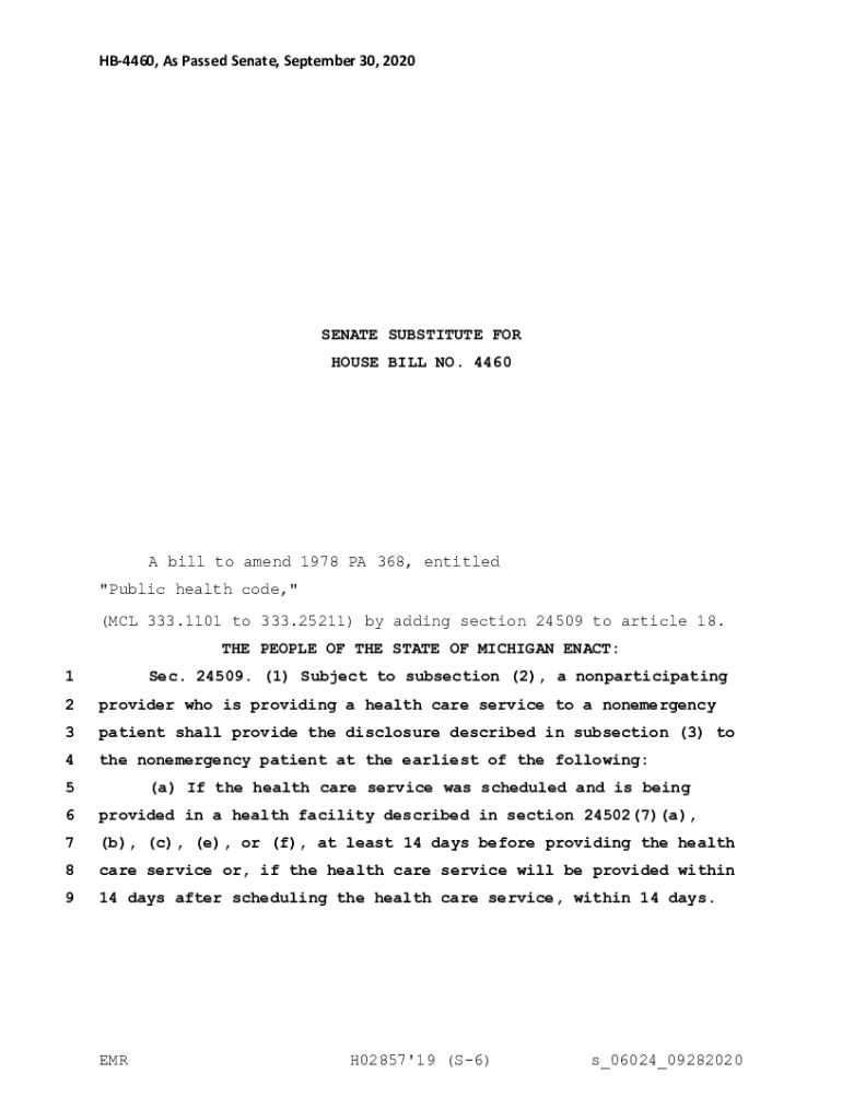 HB4460, As Passed Senate, September 30, 2020SENATE SUBSTITUTE FOR HOUSE BILL NO. 4460A bill to amend 1978 PA 368, entitled \” Public health code, \” (MCL 333.1101 to 333.25211) by adding section