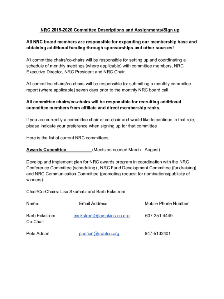 NRC 20192020 Committee Descriptions and Assignments/Sign up All NRC board members are responsible for expanding our membership base and obtaining additional funding through sponsorships and other