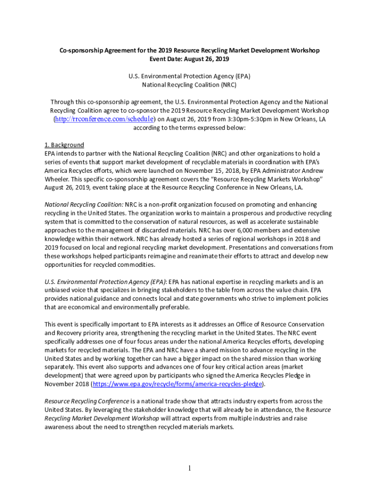 Cosponsor ship Agreement for the 2019 Resource Recycling Market Development Workshop Event Date: August 26, 2019, U.S. Environmental Protection Agency (EPA) National Recycling Coalition (NRC) Through