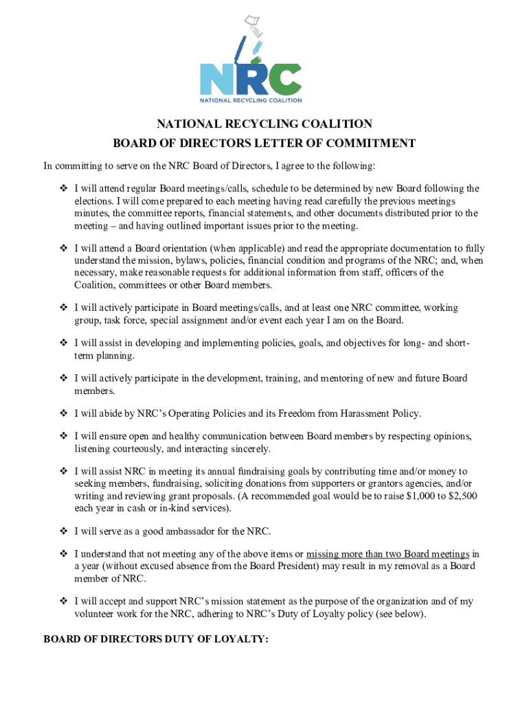 NATIONAL RECYCLING COALITION BOARD OF DIRECTORS LETTER OF COMMITMENT In committing to serve on the NRC Board of Directors, I agree to the following: v I will attend regular Board meetings/calls, schedule