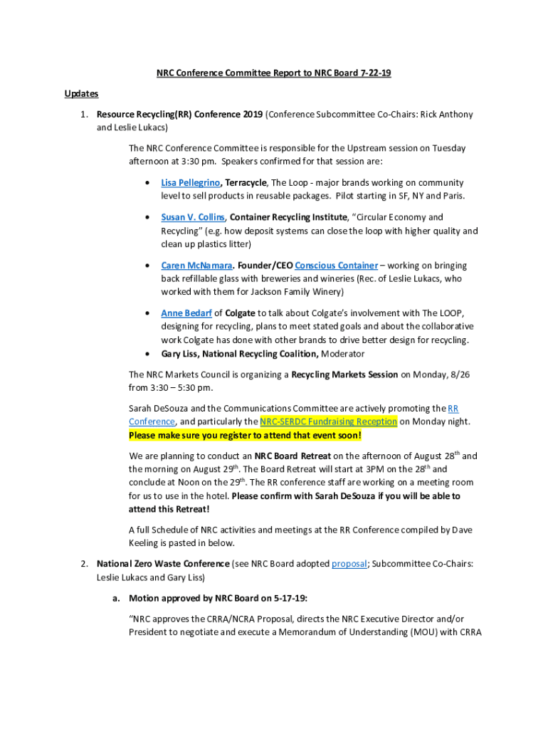 NRC Conference Committee Report to NRC Board 72219 Updates 1. Resource Recycling(RR) Conference 2019 (Conference Subcommittee Coheres: Rick Anthony and Leslie Lukas) The NRC Conference Committee is