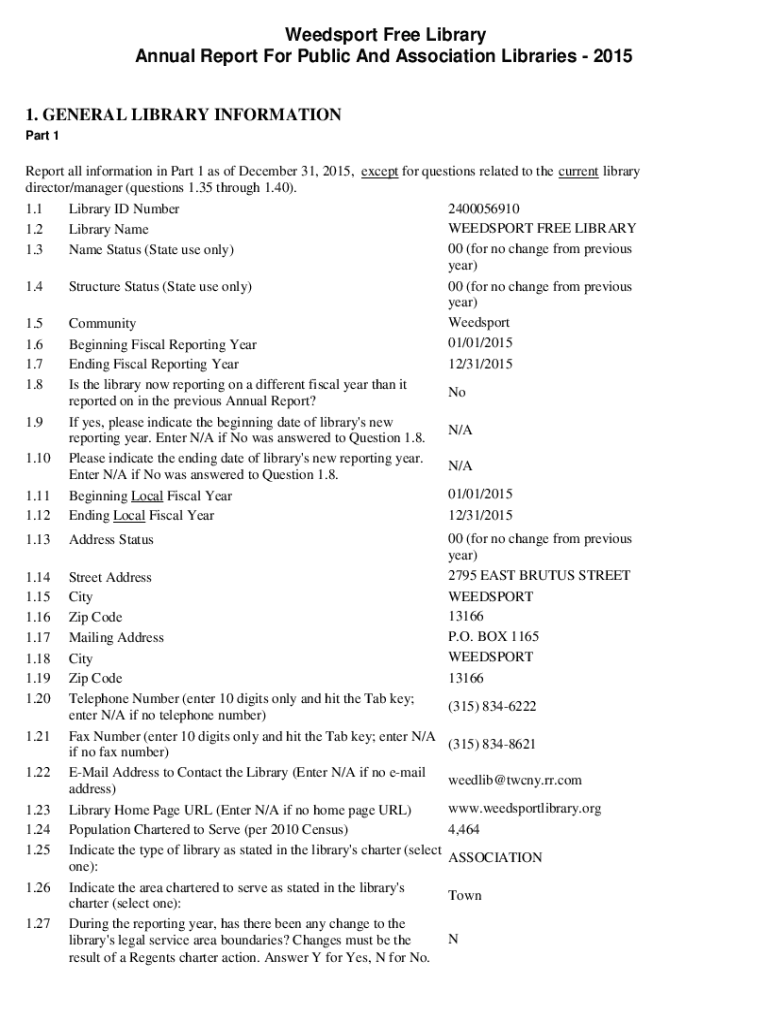 Weed sport Free Library Annual Report For Public And Association Libraries 2015 1. GENERAL LIBRARY INFORMATION Part 1Report all information in Part 1 as of December 31, 2015, except for questions