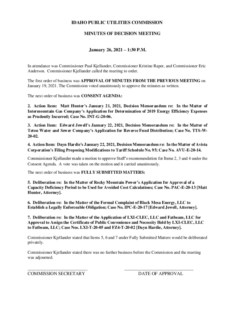 IDAHO PUBLIC UTILITIES COMMISSION MINUTES OF DECISION MEETING January 26, 2021 1:30 P.M. In attendance was Commissioner Paul Hollander, Commissioner Kristine Raper, and Commissioner Eric Anderson.