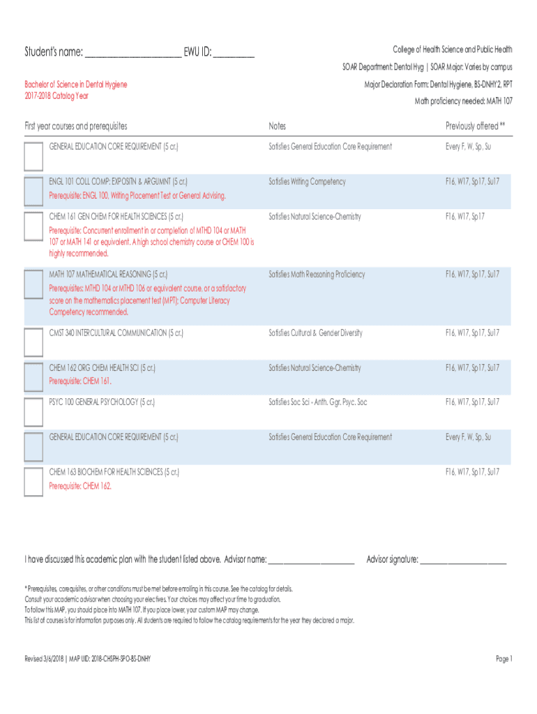 Student\'s name: ___ EU ID: ___College of Health Science and Public Health SOAR Department: Dental Hog | SOAR Major: Varies by campusBachelor of Science in Dental Hygiene 20172018 Catalog Headfirst