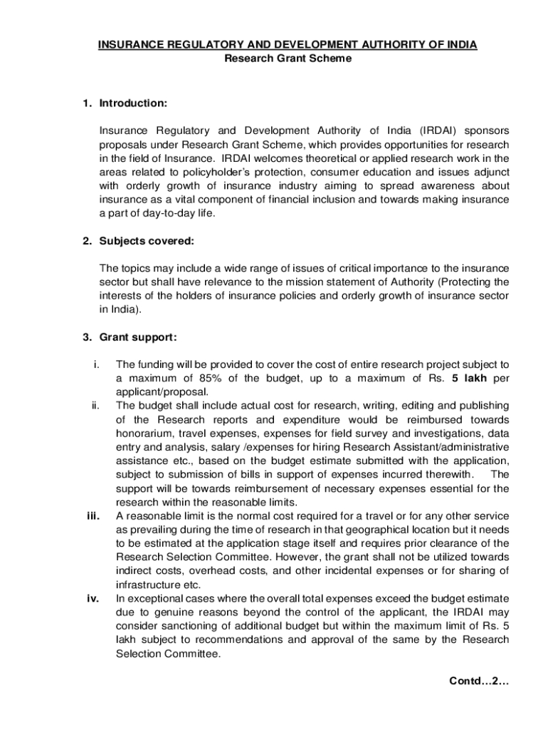 INSURANCE REGULATORY AND DEVELOPMENT AUTHORITY OF INDIA Research Grant Scheme1. Introduction: Insurance Regulatory and Development Authority of India (IR DAI) sponsors proposals under Research Grant